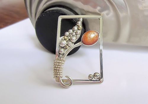 Moderne rechthoekige open zilveren broche, met een knop van een zonnesteen en een blad van zilveren en gouden bolletjes.