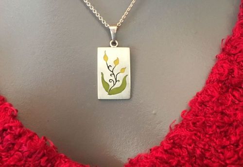 Lief klein rechthoekig handgemaakt hangertje van zilver, met een ingelegd plantmotiefje in verschillende kleuren groen koud-emaille.